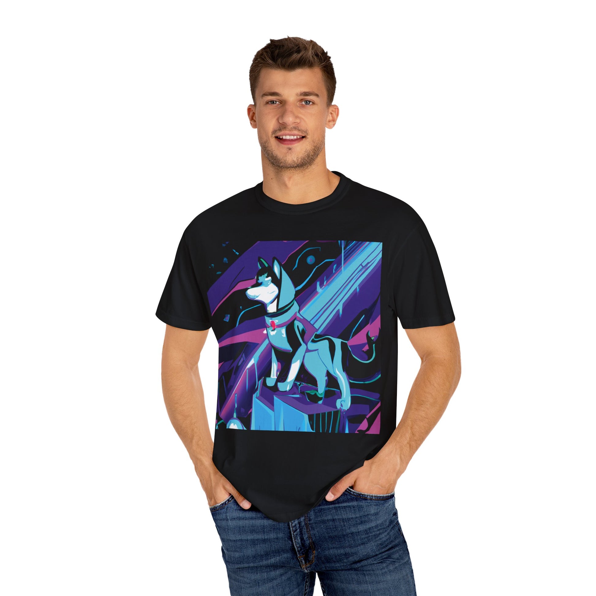 A relaxed, garment-dyed tee that brings bold, neon energy to everyday wear. The front features a stylized husky rendered in electric blues, purples, and magentas — a confident companion standing against geometric, futuristic shapes. The back carries a vertical, hand-drawn site logo in bright green for a streetwise, indie feel. Soft, post-dye cotton and a roomy cut make this shirt feel broken-in from the first wear. Wear it to late-night meetups, art shows, or city walks when you want a statement piece that reads playful, proud, and a little adventurous.