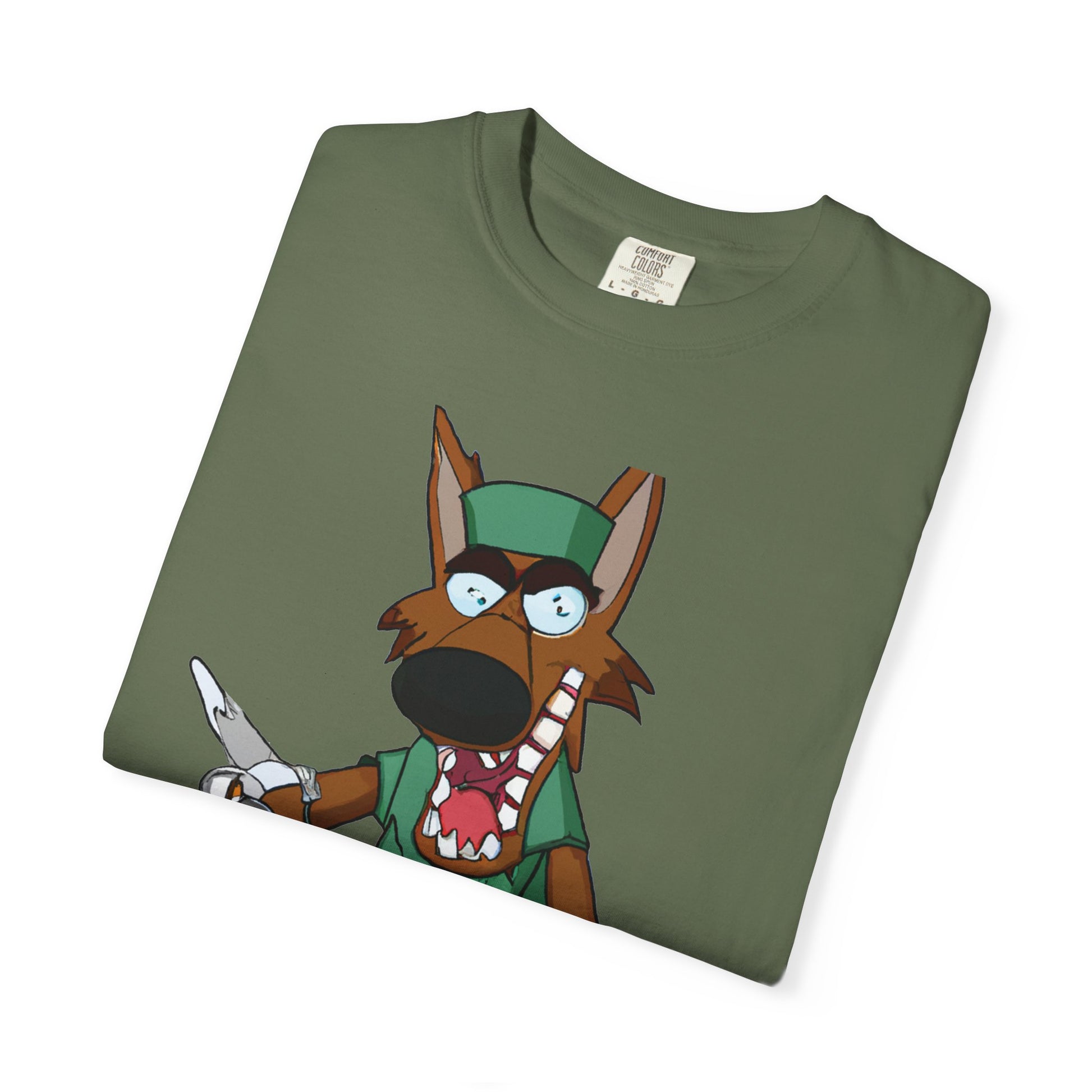 This relaxed-fit garment-dyed tee brings a playful, rebellious energy to everyday wear. The front shows a bold cartoon fox character—bandana, dagger, and all—rendered in eye-catching colors that feel lively against the soft, lived-in dye of the fabric. On the back, a casual vertical script adds a streetwise signature that reads like a tag from a favorite underground zine. It’s the kind of shirt that slips comfortably into weekend routines: skate sessions, late-night diner runs, or chilled hangouts where personality matters more than polish. The medium-weight cotton drapes easily, the tubular knit keeps the silhouette clean, and the pre-shrunk ring-spun fibers give it a familiar, broken-in feel from the first wear. For people who lean into quirky character art and offbeat style, this tee reads loud and clear—fun, a little dangerous, and unapologetically expressive.