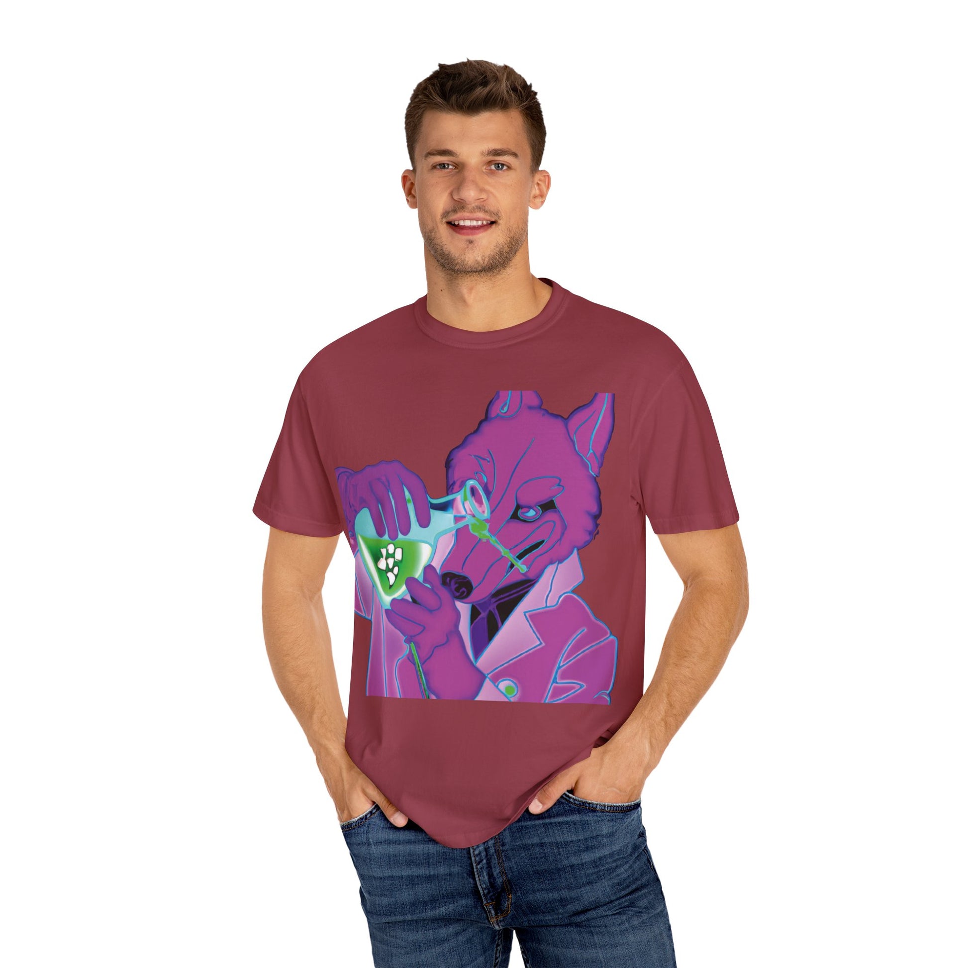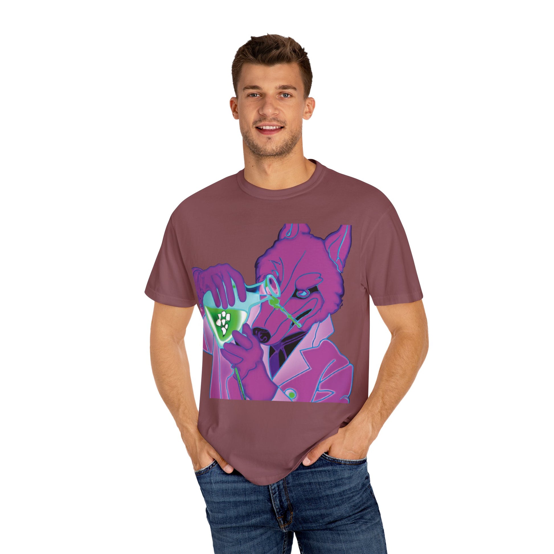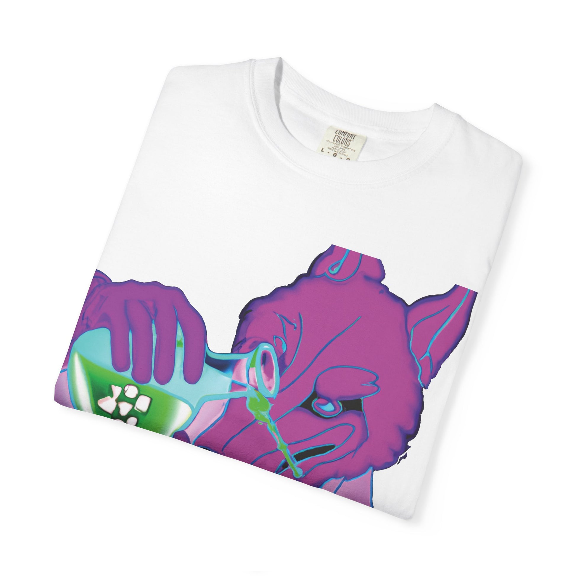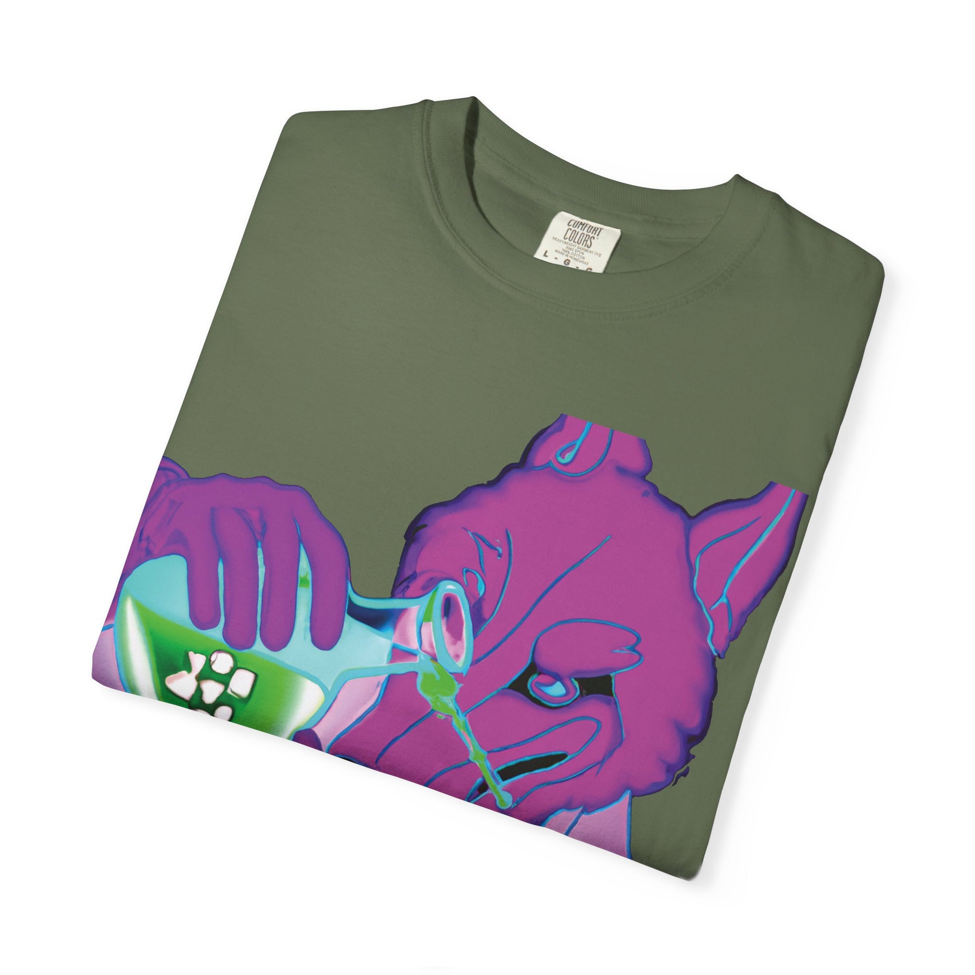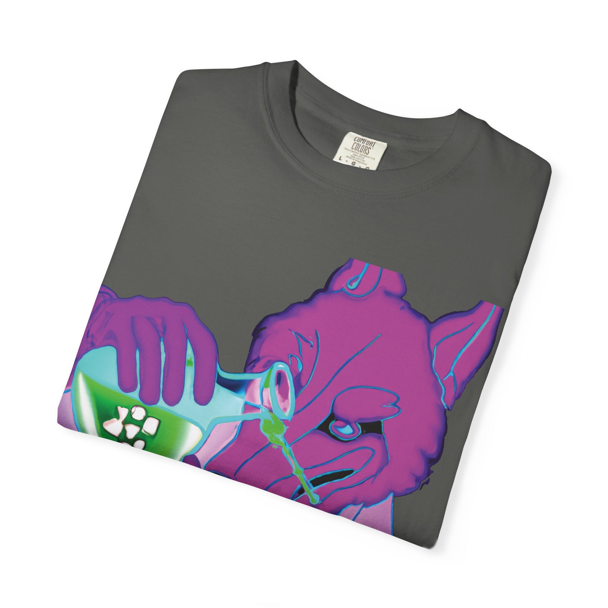 Slide into a relaxed tee that feels as lived-in as your favorite sketchbook. This garment-dyed cotton shirt carries a bold, neon-hued fox scientist illustration on the front — equal parts playful and edgy — with a handwritten vertical logo down the back. It sits roomy across the shoulders and drapes with soft, broken-in color and texture from the post-construction dye. Wear it to late-night lab sessions, art shows, or when you want your outfit to say curious, irreverent, and a little experimental.