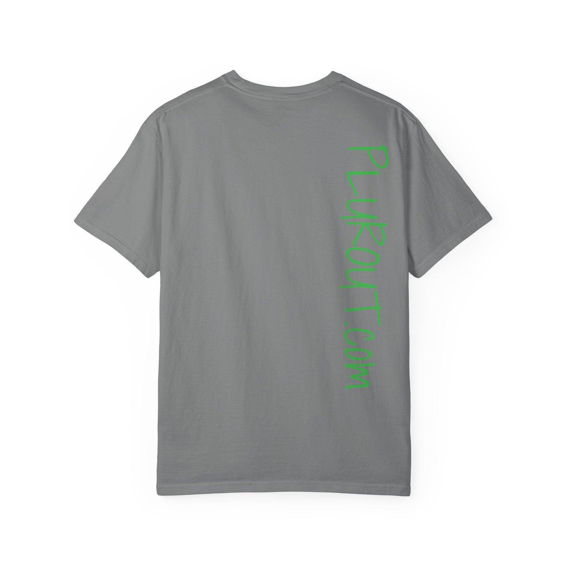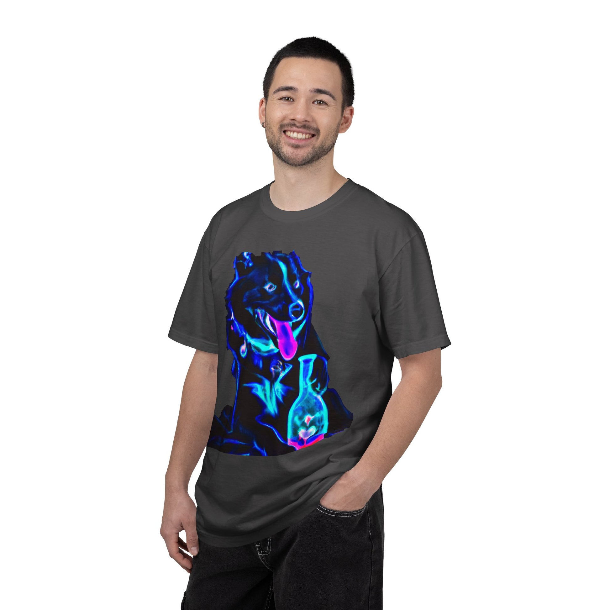 This relaxed-fit garment-dyed tee brings a late-night neon vibe to everyday wear. A stylized dog portrait in electric blues and magenta takes center stage, tongue out and eyes gleaming, while a whimsical bottle marked with tiny hearts sits beside it — playful and a little mysterious. The back shows a vertical, handwritten-style web address in bright green for an urban, DIY edge. Wear it for laid-back nights, street strolls, or when you want a piece that reads like a small story: loyal, curious, and a touch mischievous. The soft, garment-dyed cotton feels lived-in from the first wear and drapes casually for easy layering or solo wear.