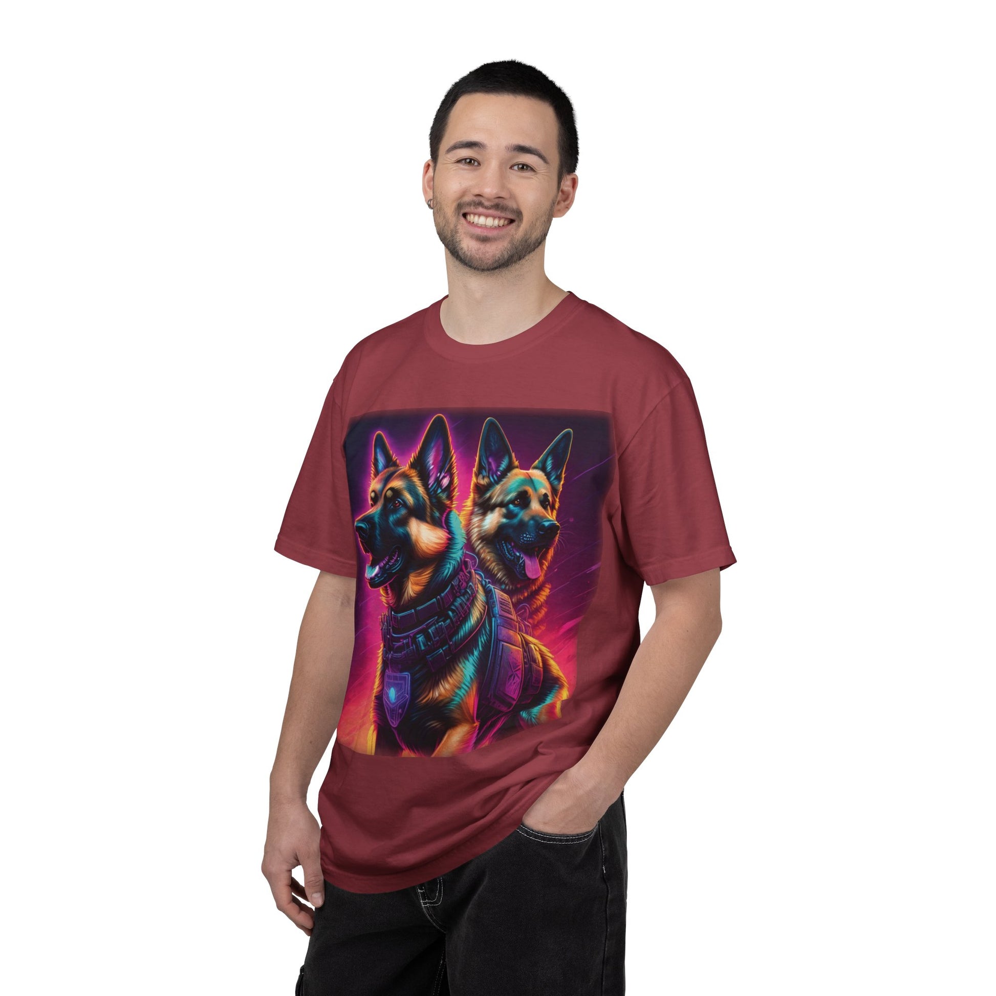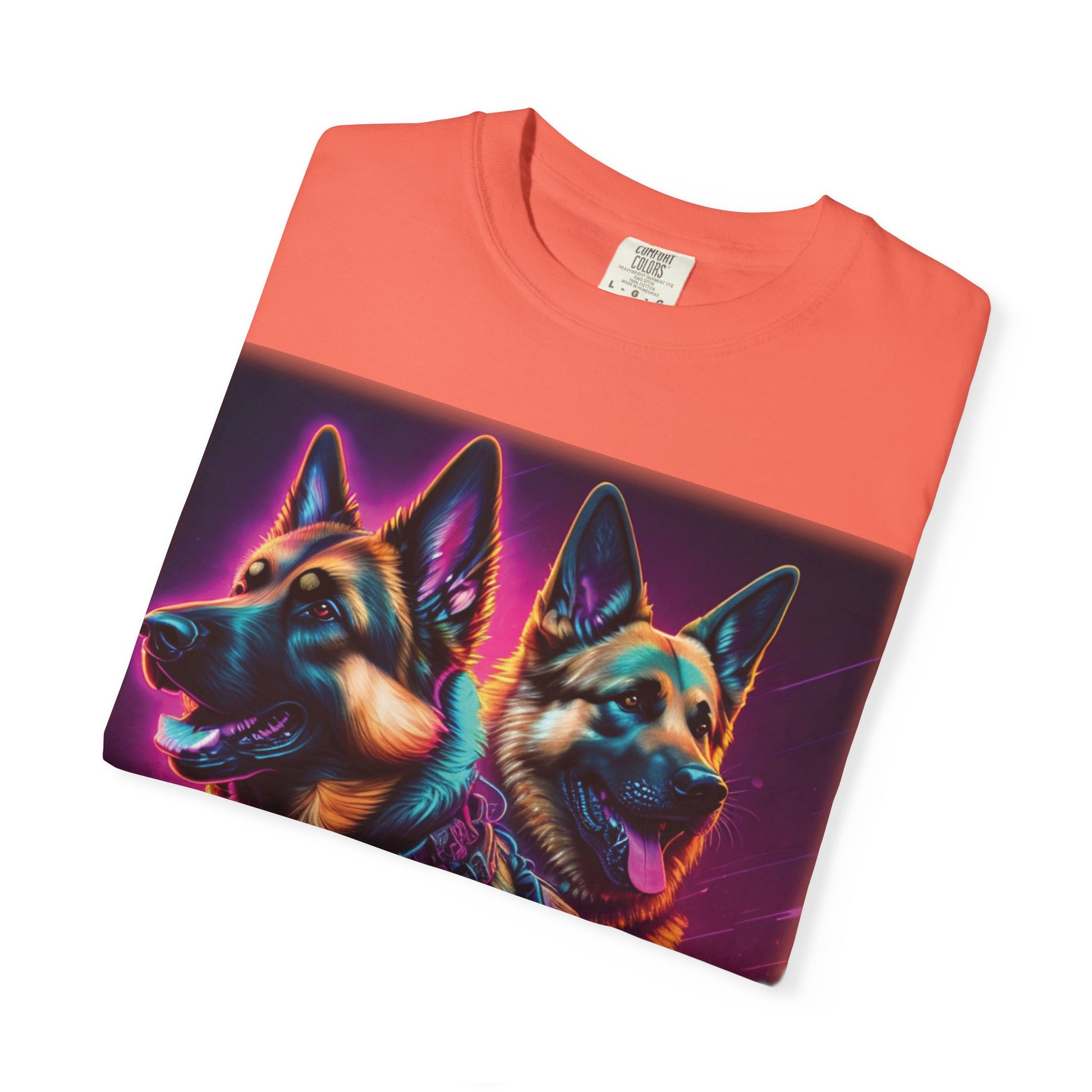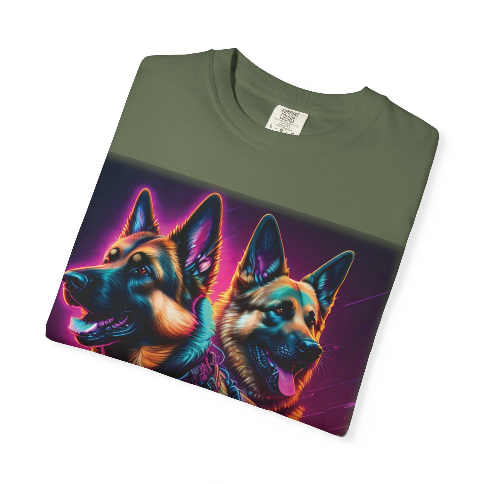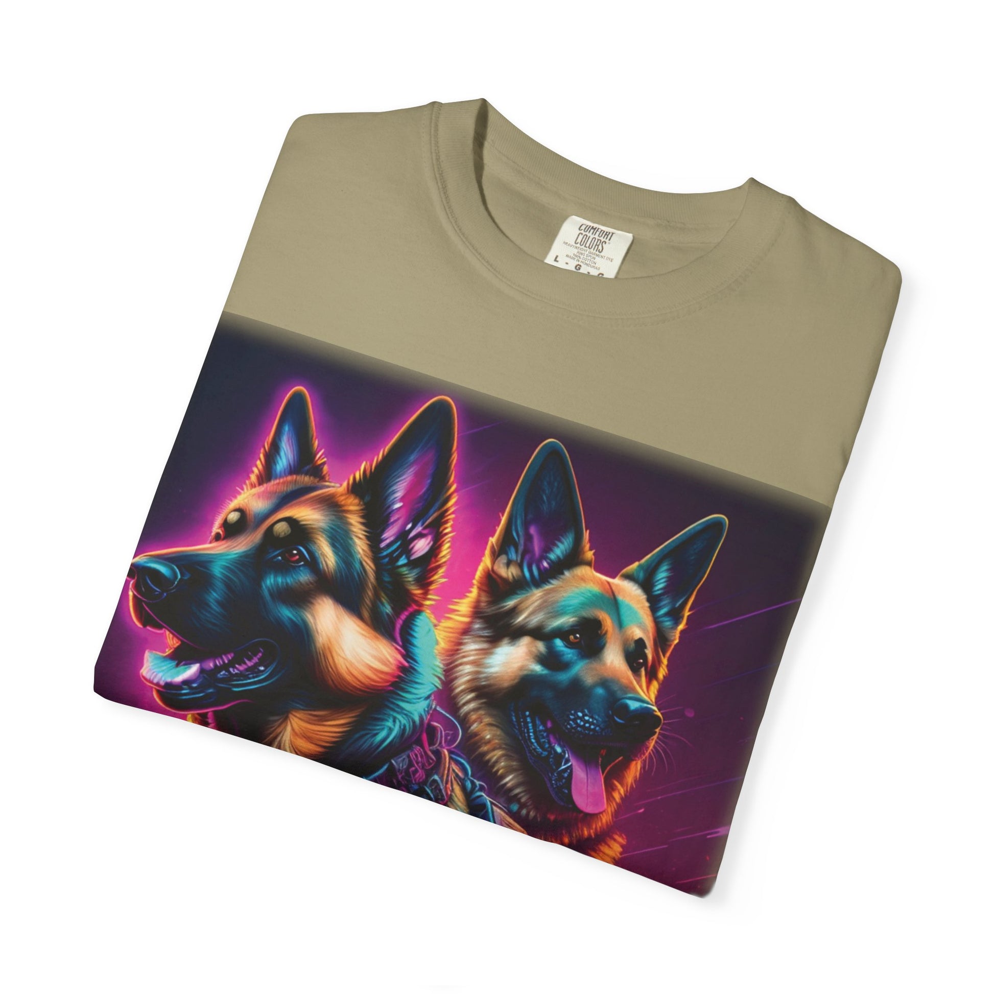 This relaxed garment-dyed tee brings bold, neon energy to a comfortable everyday silhouette. A vivid, retro-futuristic print of two alert German Shepherds sits on the chest, rendered in electric pinks, purples, and teal that catch the eye without feeling loud thanks to the soft, washed-down color of the fabric. The back features a vertical handwritten-style logo that adds a casual, streetwear edge. Wear it to add a confident, playful statement to city walks, late-night meetups, or creative studio days — it layers easily under jackets or stands alone as the focal point of an outfit.