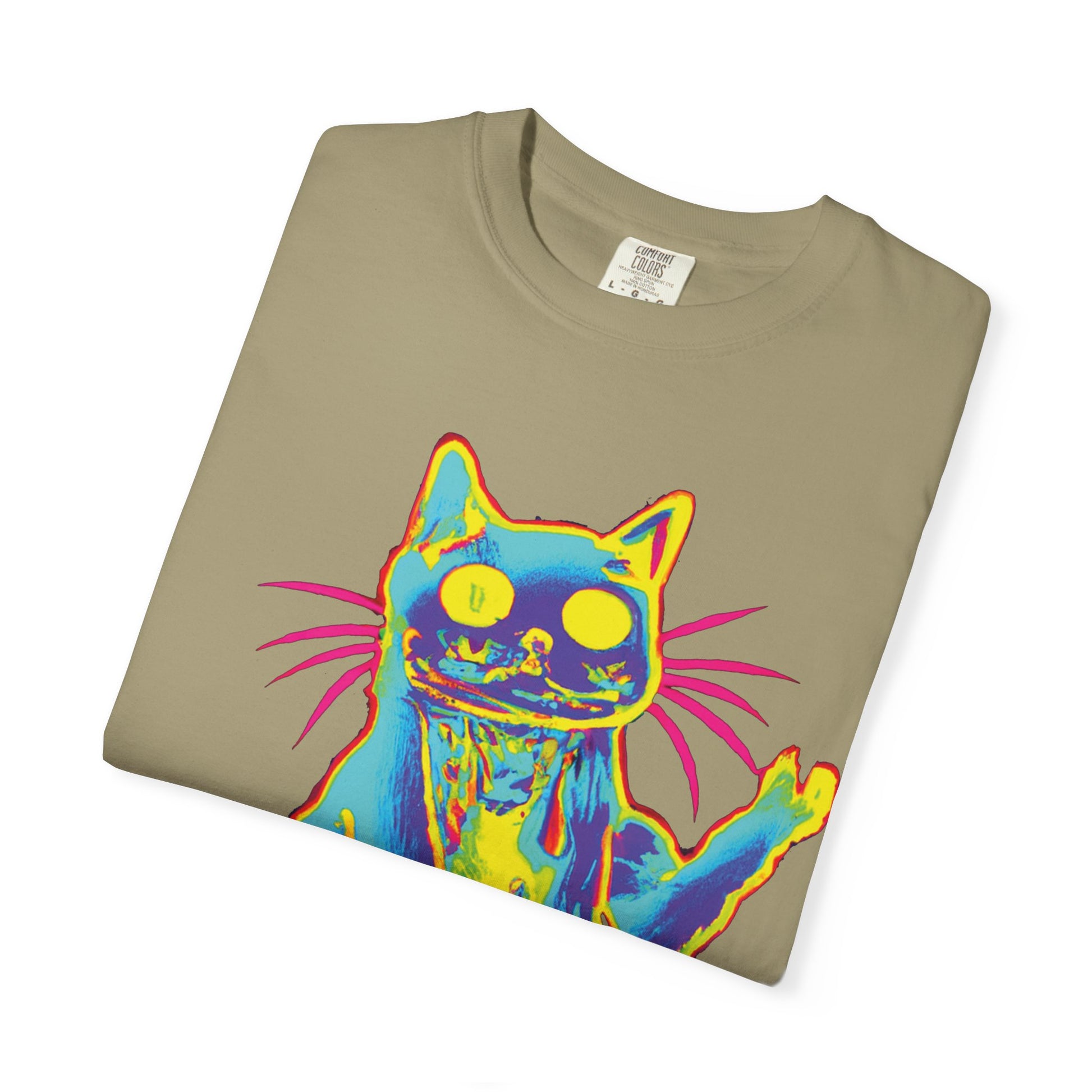 Bright, playful, and a little mischievous — this garment-dyed tee brings neon energy to everyday wear. A bold, psychedelic cat graphic sits center chest in electric blues, yellows, and hot pinks, while a vertical, hand-written style site name trails down the back for an offbeat, streetwise touch. The feel is worn-in and soft from the dye-after-construction process, so the colors sit like a lived-in memory rather than a loud poster. Slip it on for long walks, late-night record runs, or lazy afternoons with friends—this shirt reads like someone who shows up for adventure and laughs at the tiny unpredictabilities of the day.