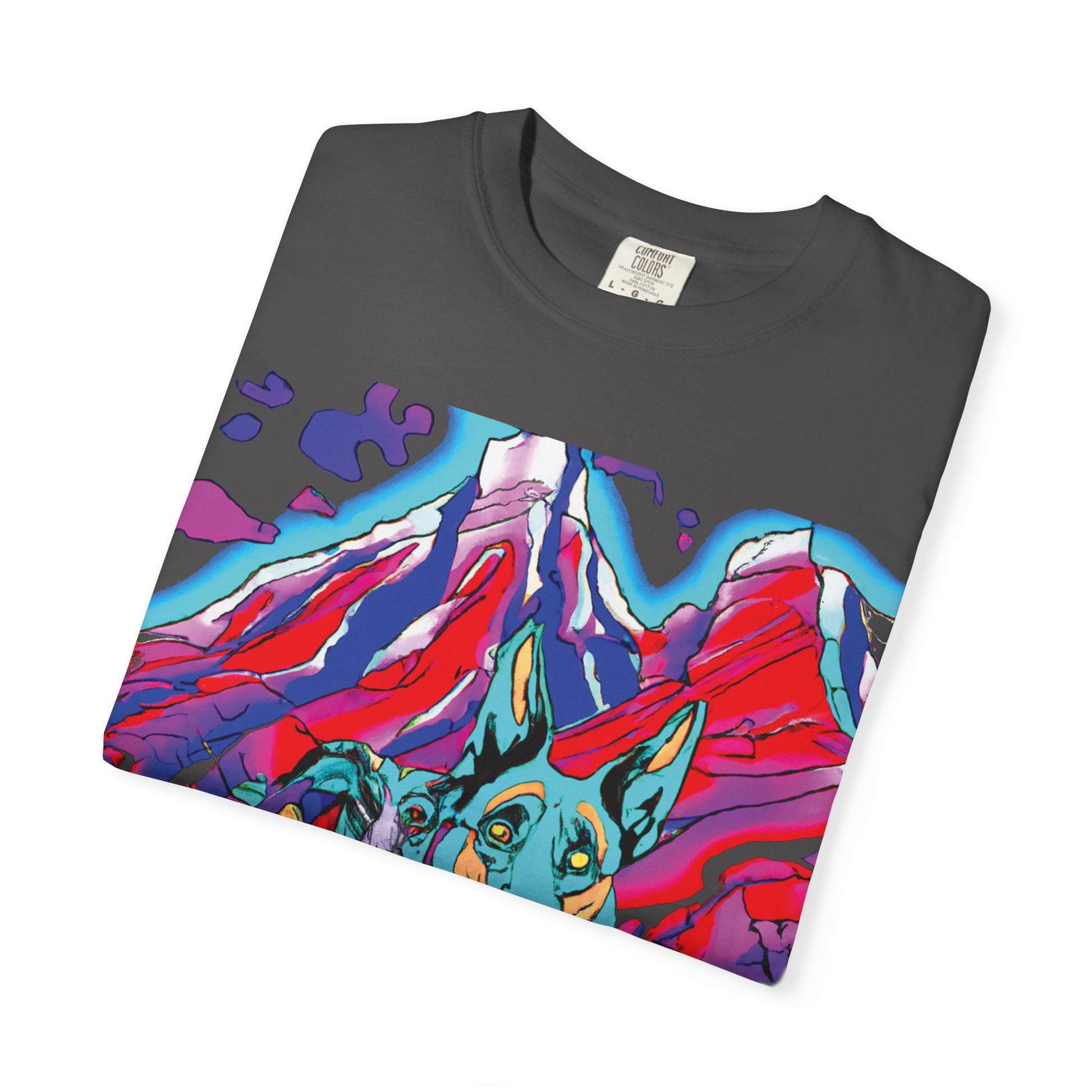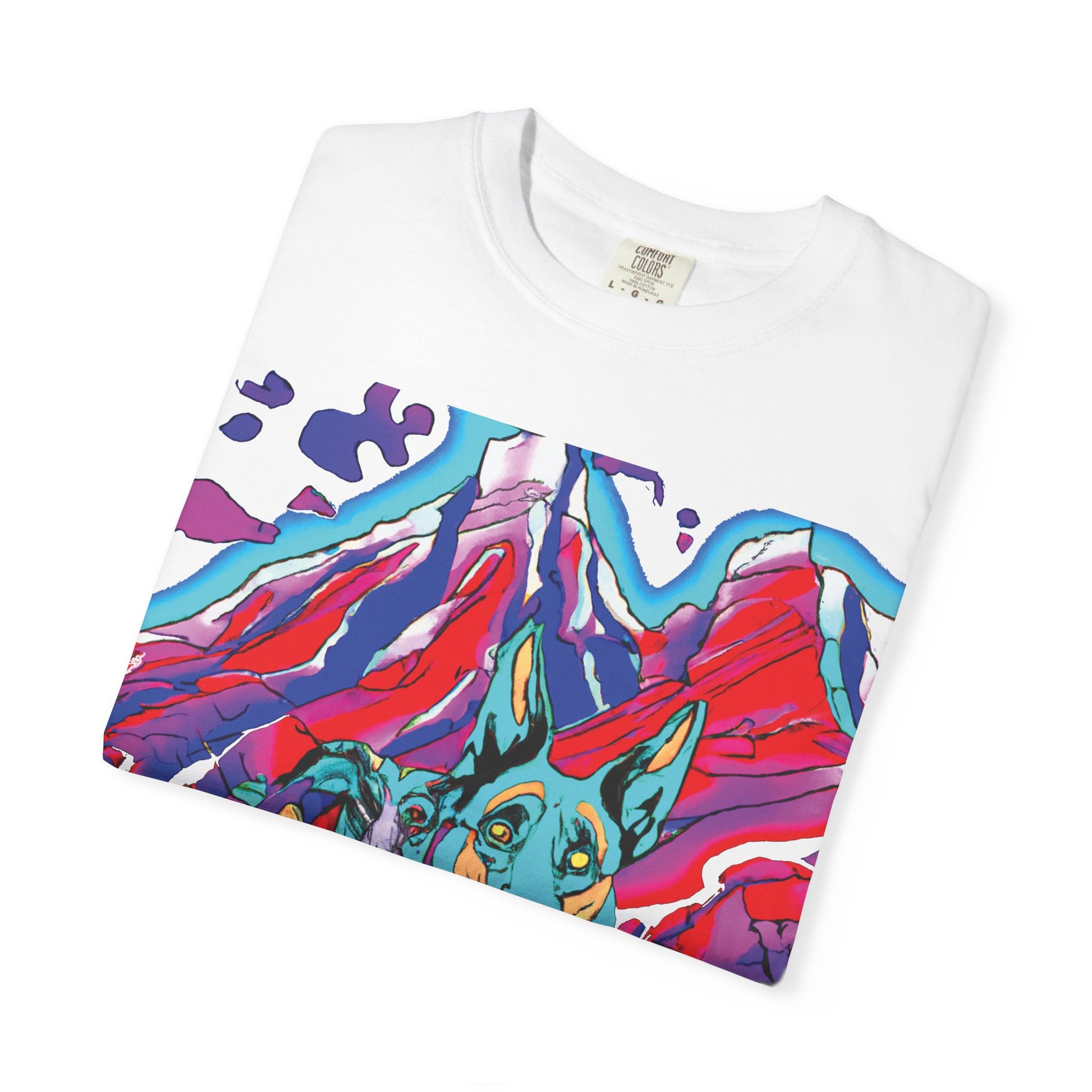 This garment-dyed tee brings bold, painterly energy to everyday wear. A vibrant, pop-art style print of two attentive dogs set against swirling, saturated mountains covers the chest — color and motion that read like a travel sketchbook. The relaxed fit and soft, garment-dyed cotton invite wear after wear, breaking in and developing character over time. On the back, a casual vertical script adds an offbeat, streetwise signature. Wear it on weekend escapes, dog-walk mornings, or gallery-hopping afternoons when you want something that feels handmade, expressive, and comfortably lived-in.