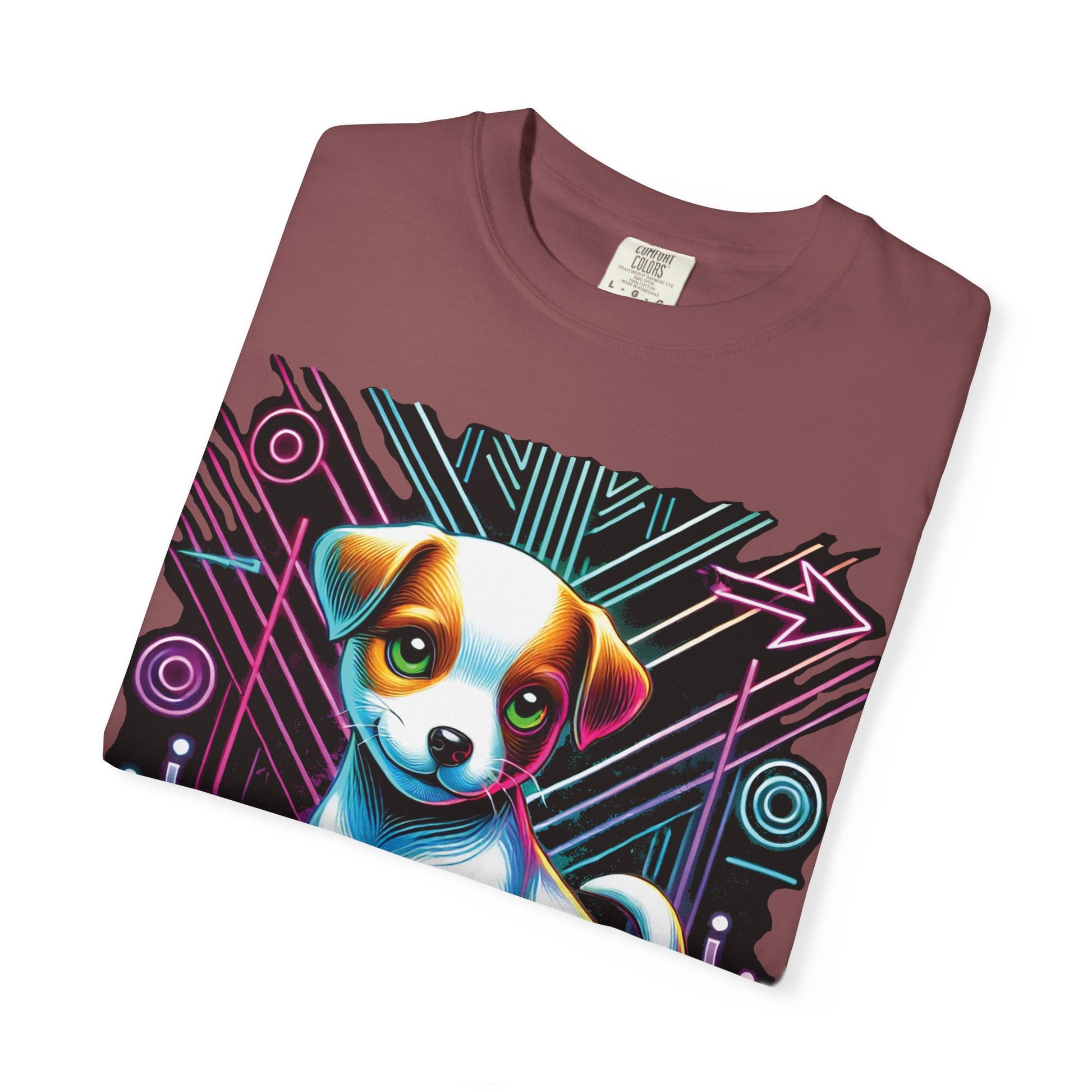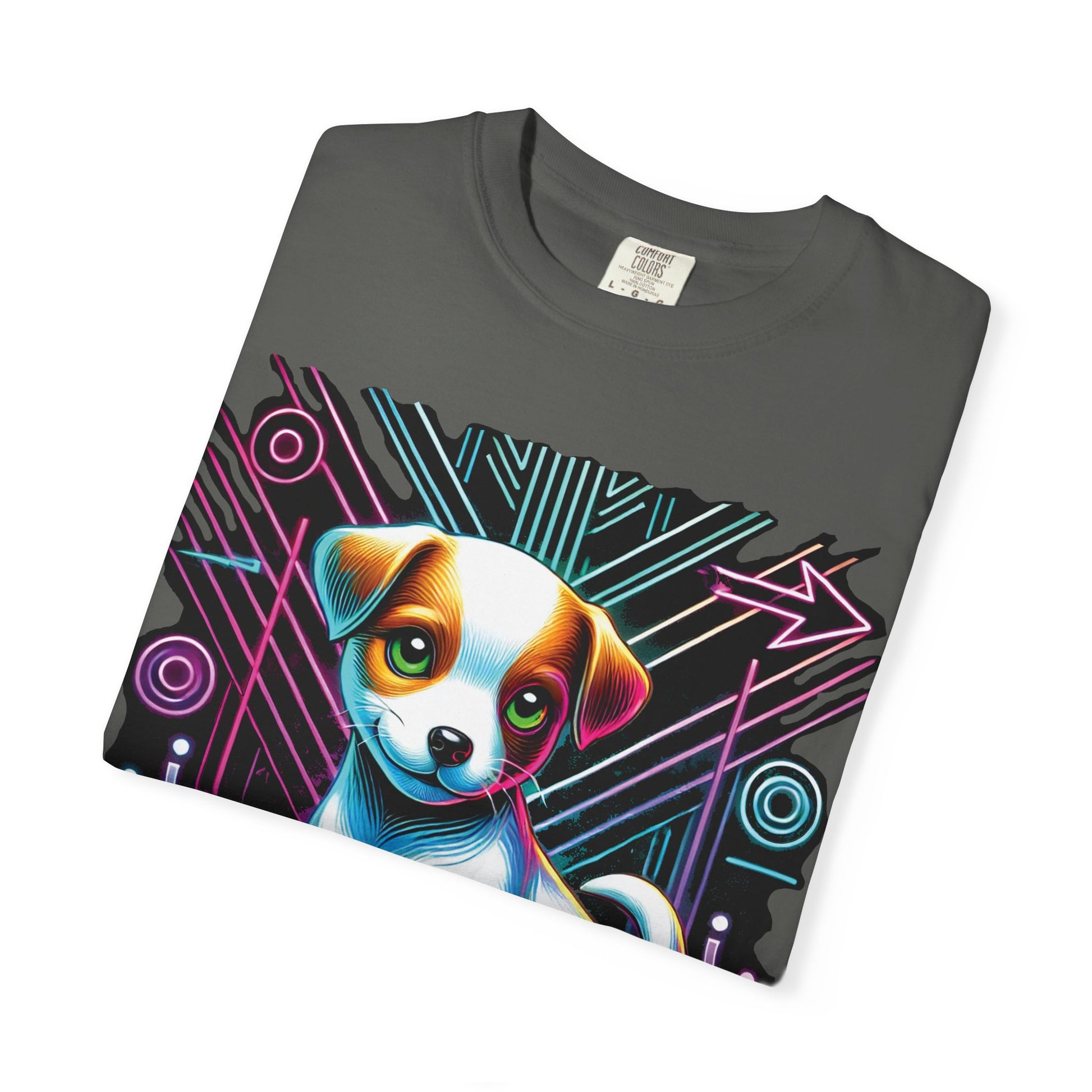 A relaxed, garment-dyed tee that brings playful nostalgia and neon energy to everyday wear. Soft, pre-shrunk 100% ring-spun cotton and a midweight hand give this shirt a lived-in feel right away. Front artwork features a wide-eyed puppy rendered in vibrant retro-futuristic colors and geometric accents — a tiny, hopeful character that brightens a commute, a studio session, or a laid-back weekend. The back shows a vertical, hand-drawn style web signature in bright green, adding a casual, streetwise touch. Wear it with worn denim and low-top sneakers for a casual, expressive look that reads both warm and a little electric.