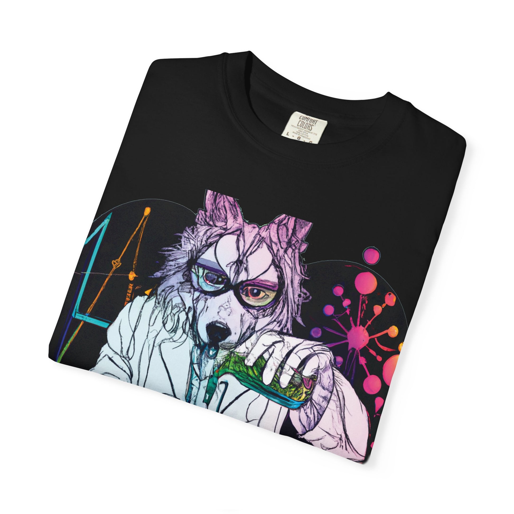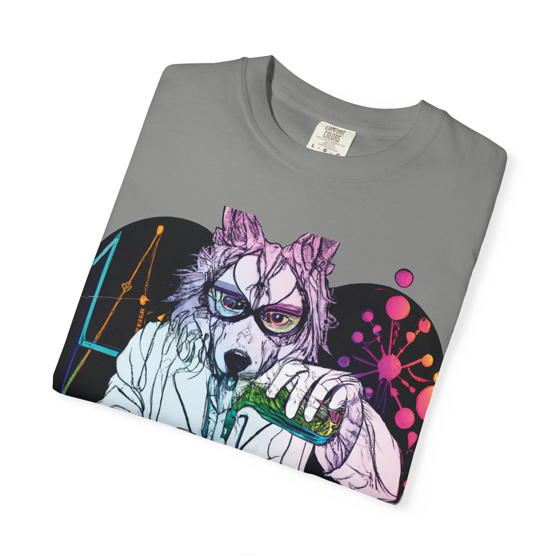This garment-dyed tee brings a playful, slightly mad-scientist energy to everyday wear. A wolf-faced chemist, rendered in vivid, hand-drawn colors inside a heart-shaped composition, mixes bubbling chemicals that glow and drip with neon life. The relaxed, medium-weight cotton and soft garment-dyed finish give the print a lived-in, artful vibe that sits naturally in streetwear or studio wardrobes. Wear it while sketching late-night ideas, wandering craft fairs, or hanging out with friends who get your offbeat sense of humor. The back features a vertical, hand-lettered URL in bright green that adds an extra splash of personality without overpowering the front illustration. It reads like a badge for curious creatives who love science, quirky art, and playful, slightly subversive style.